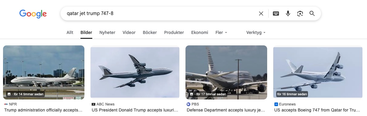 Påhejad av Fox News, konstaterade Trump att det vore ”dumt” att inte acceptera gåvan. Affären föll därefter snabbt ned i detaljer i nyhetsrapporteringen: vad kostar det att bygga om Qatar-planet så att det kan användas av presidenten? Kan Trump fortsätta använda maskinen även efter 20 januari 2029 då han avgår? Och varför dröjer förresten de två helt nya Boeing-plan som USA redan beställt att ersätta de två 35 år gamla Air Force One?